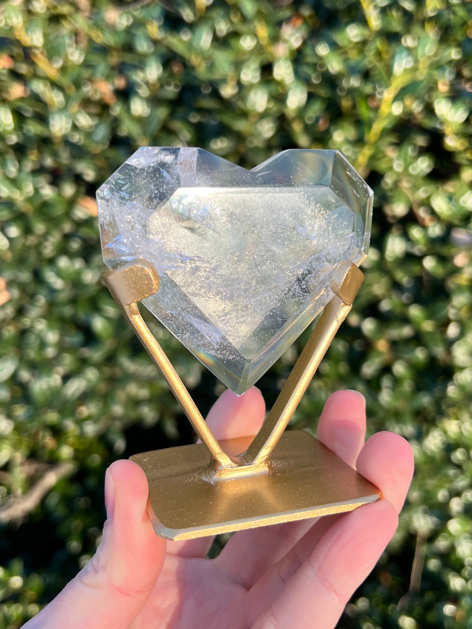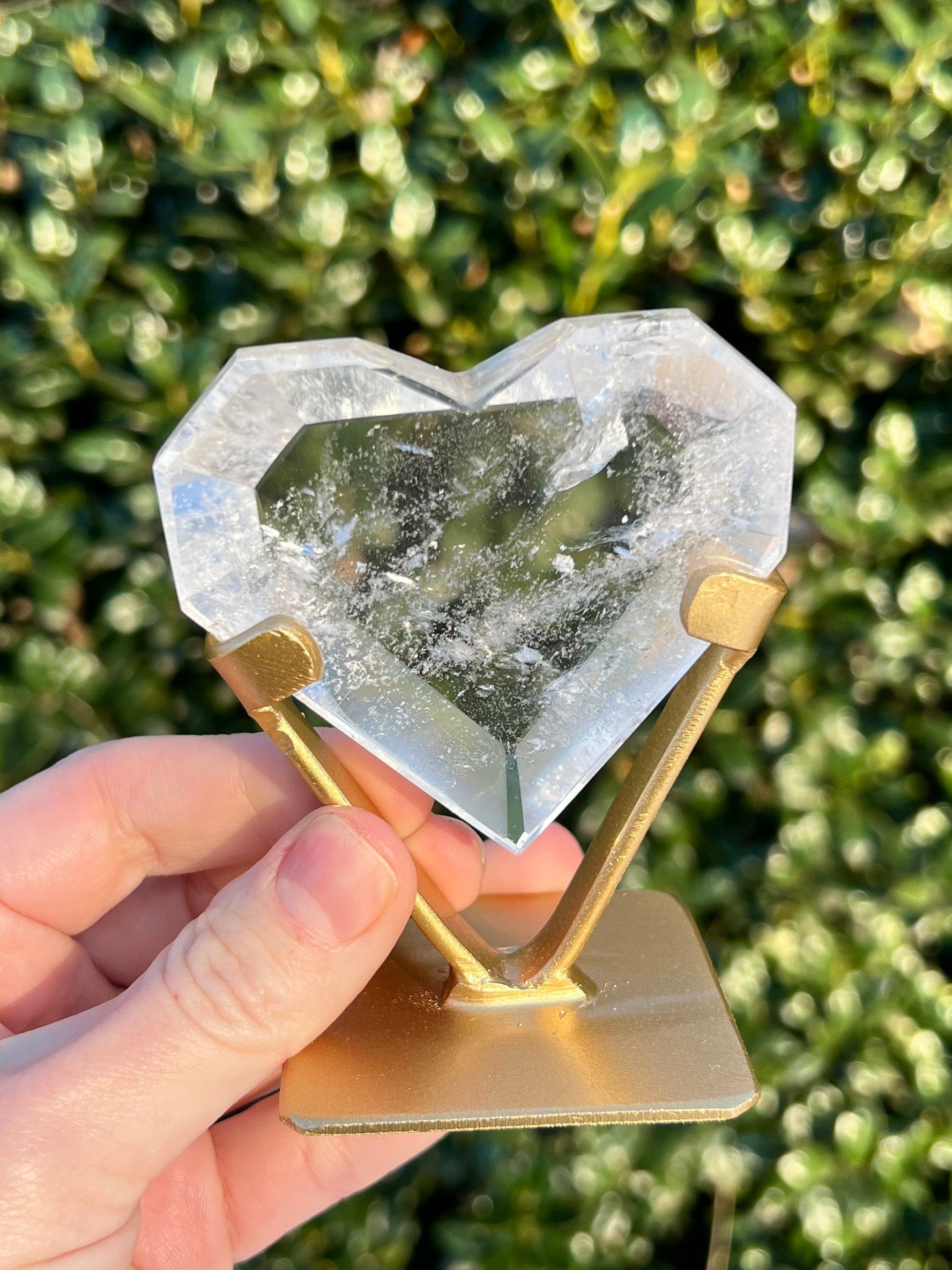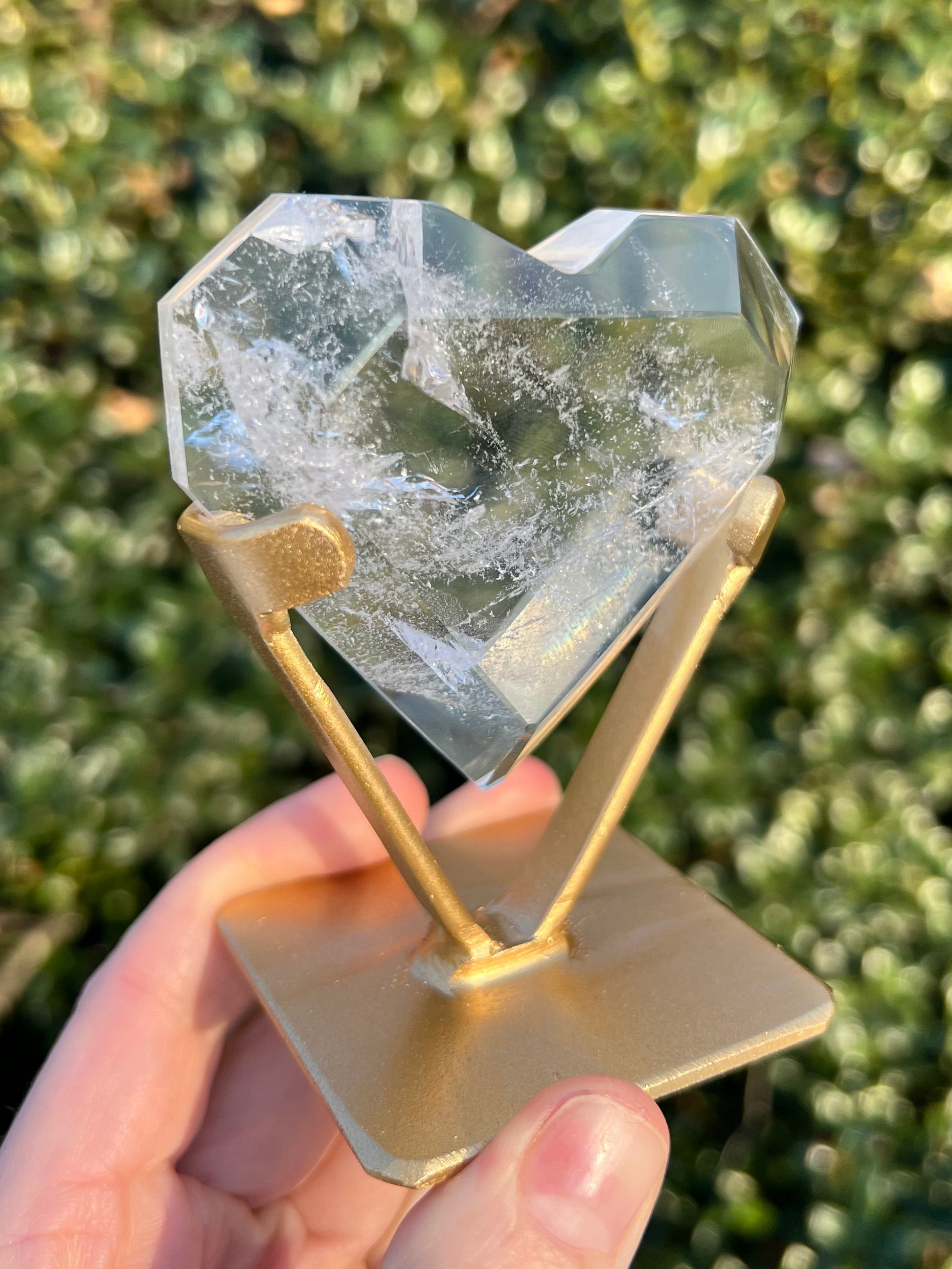 These Faceted Quartz Hearts on Stands are stunning, one of a kind pieces that offer a rare chance to display the pinnacle of Earth's beauty in your home! These hearts were hand-carved by skilled artisans using only the highest quality Brazilian quartz! Two hearts are made from Clear Quartz, one from Smoky Quartz, and one from Rutilated Quartz. All are breathtaking pieces that symbolize the love created in Nature and felt within our souls.