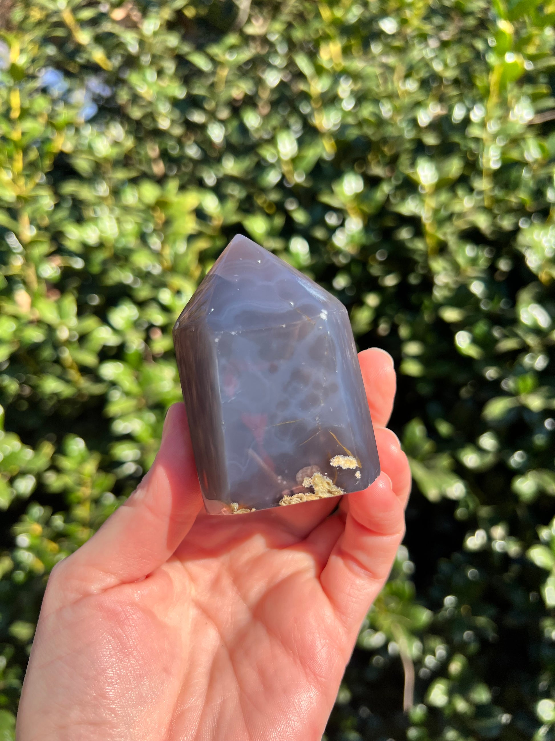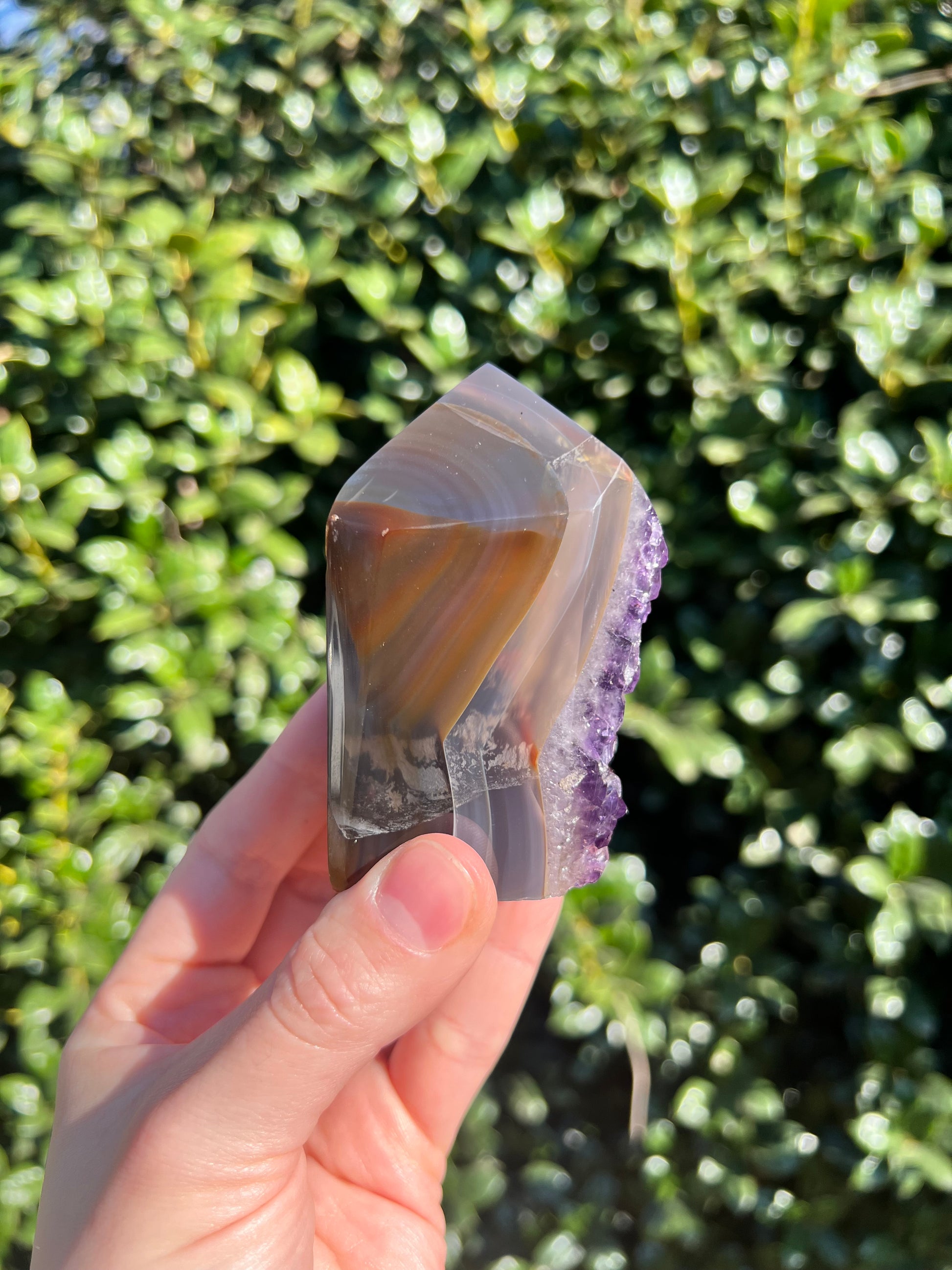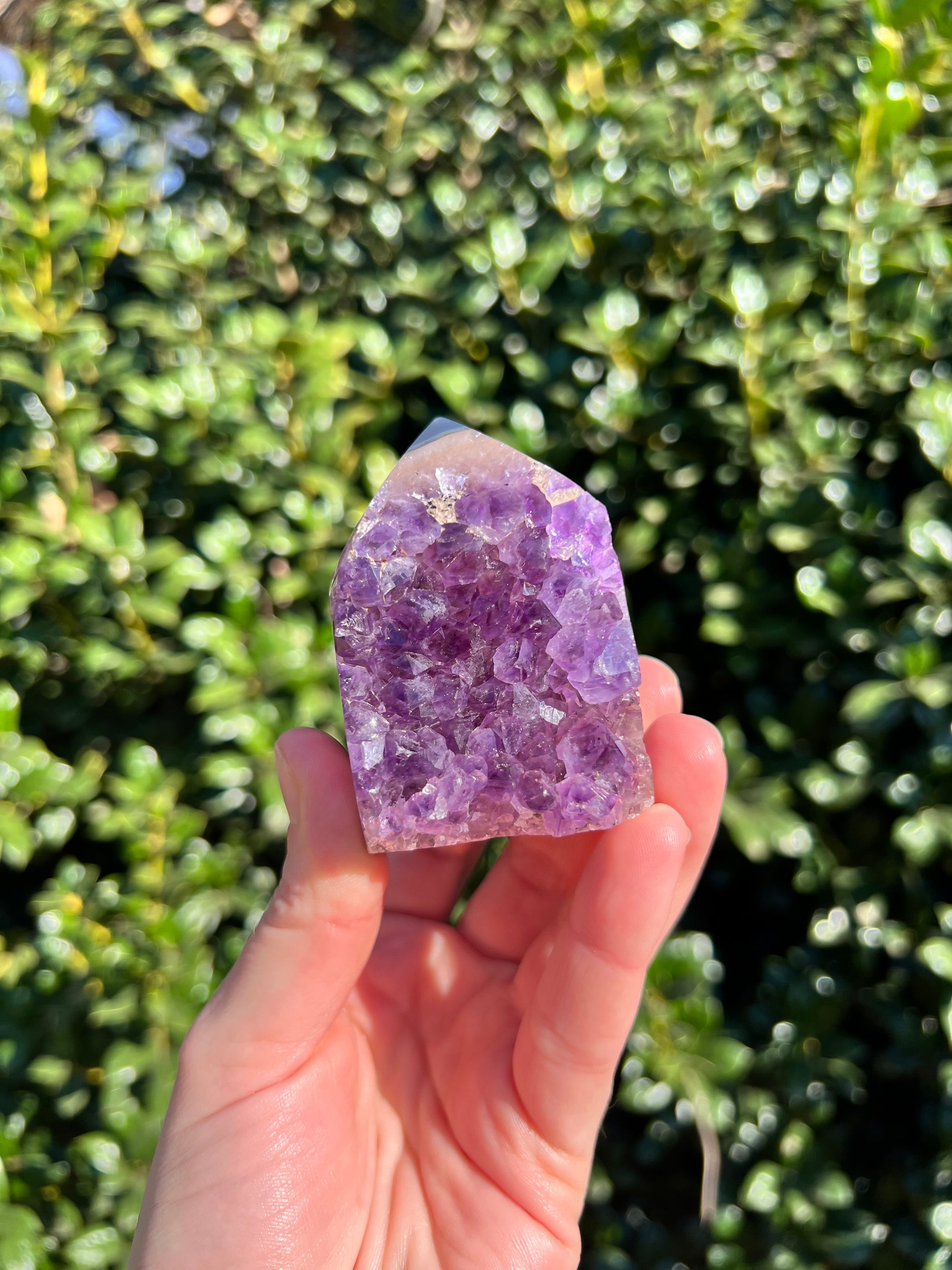 Marvel at these stunning, all natural Amethyst Points! These Amethyst Points come from Brazil on the border of Uruguay, globally recognized for their abundant Amethyst deposits. These points also feature gorgeous Agate banding on the sides and back of each piece. Use Amethyst in the home to maintain positive and balanced energy! Amethyst is used to alleviate stress and uplift your energy within the self and environment. Amethyst promotes relaxed, serene, and balanced energy.