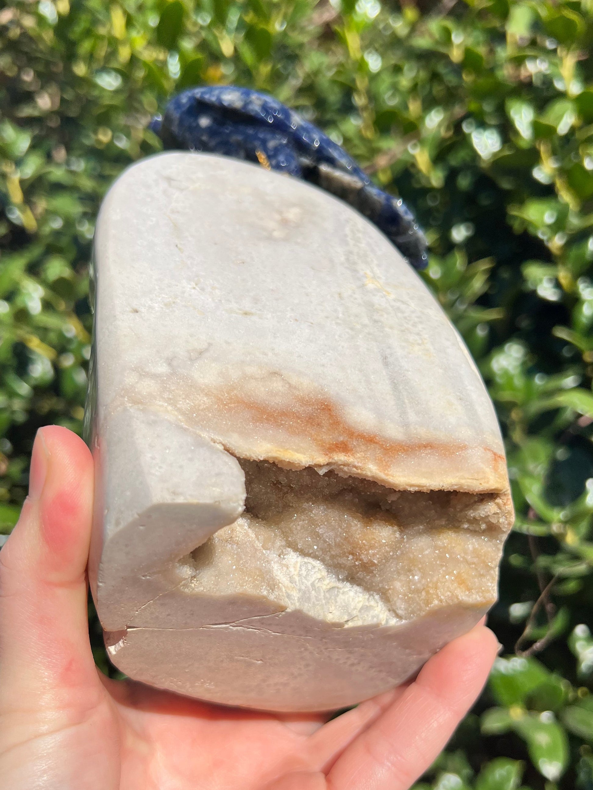 Sodalite Owl on Pink Amethyst- A Sodalite owl perched on a large base of Pink Amethyst with druzy on the front and back of the stone. Height: 8 in Width: 4 in
