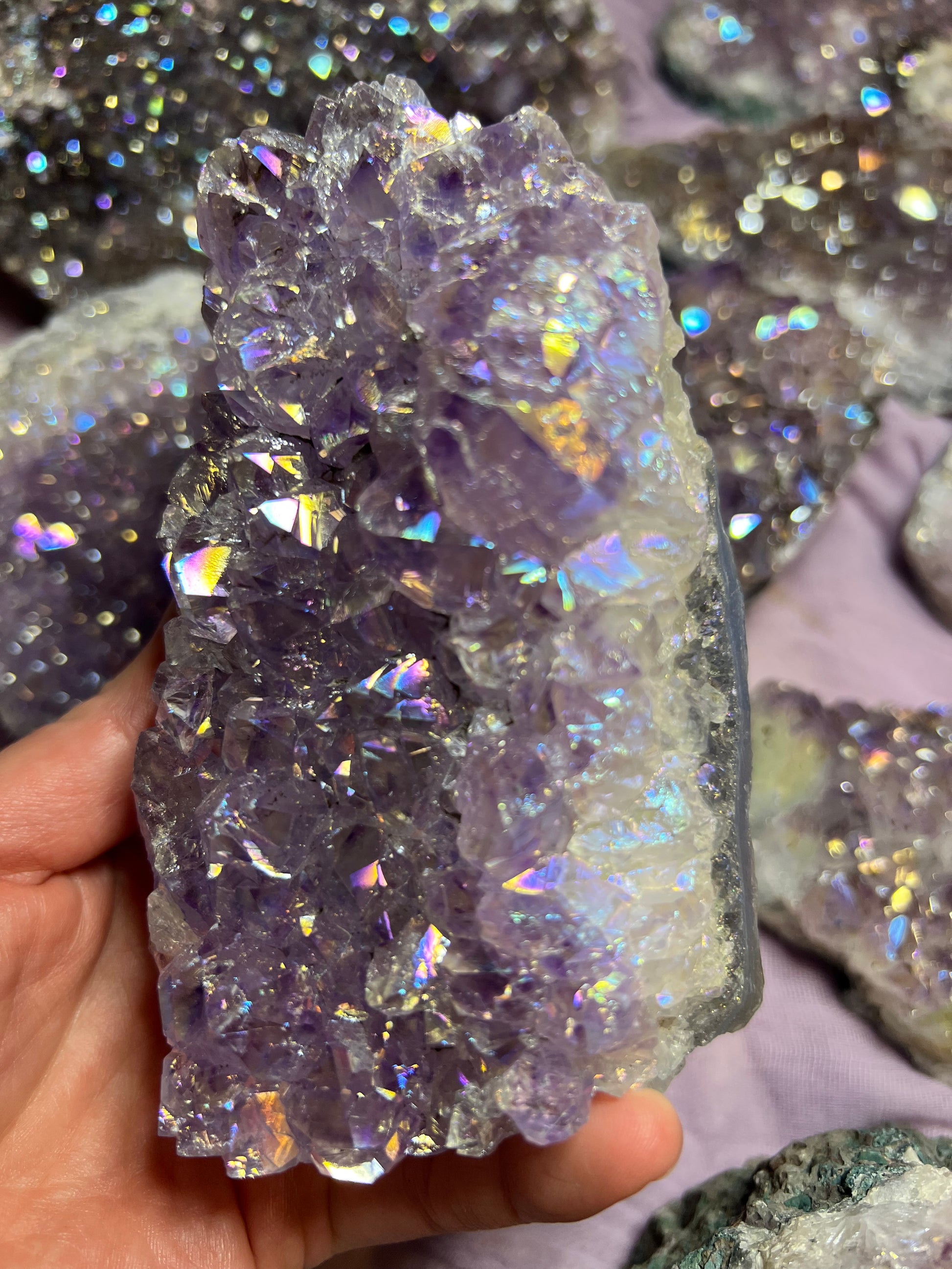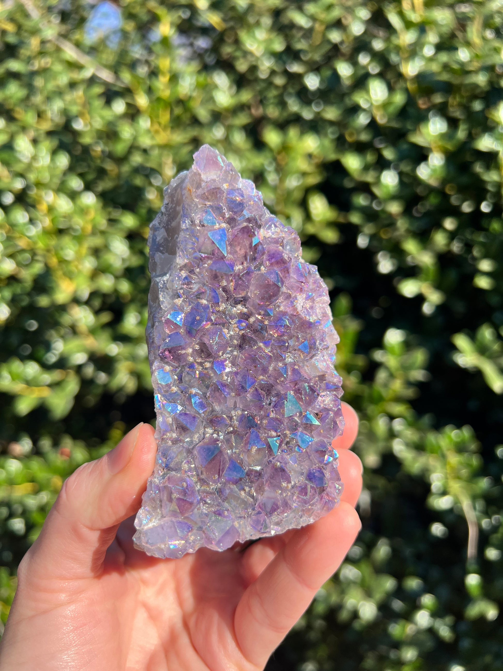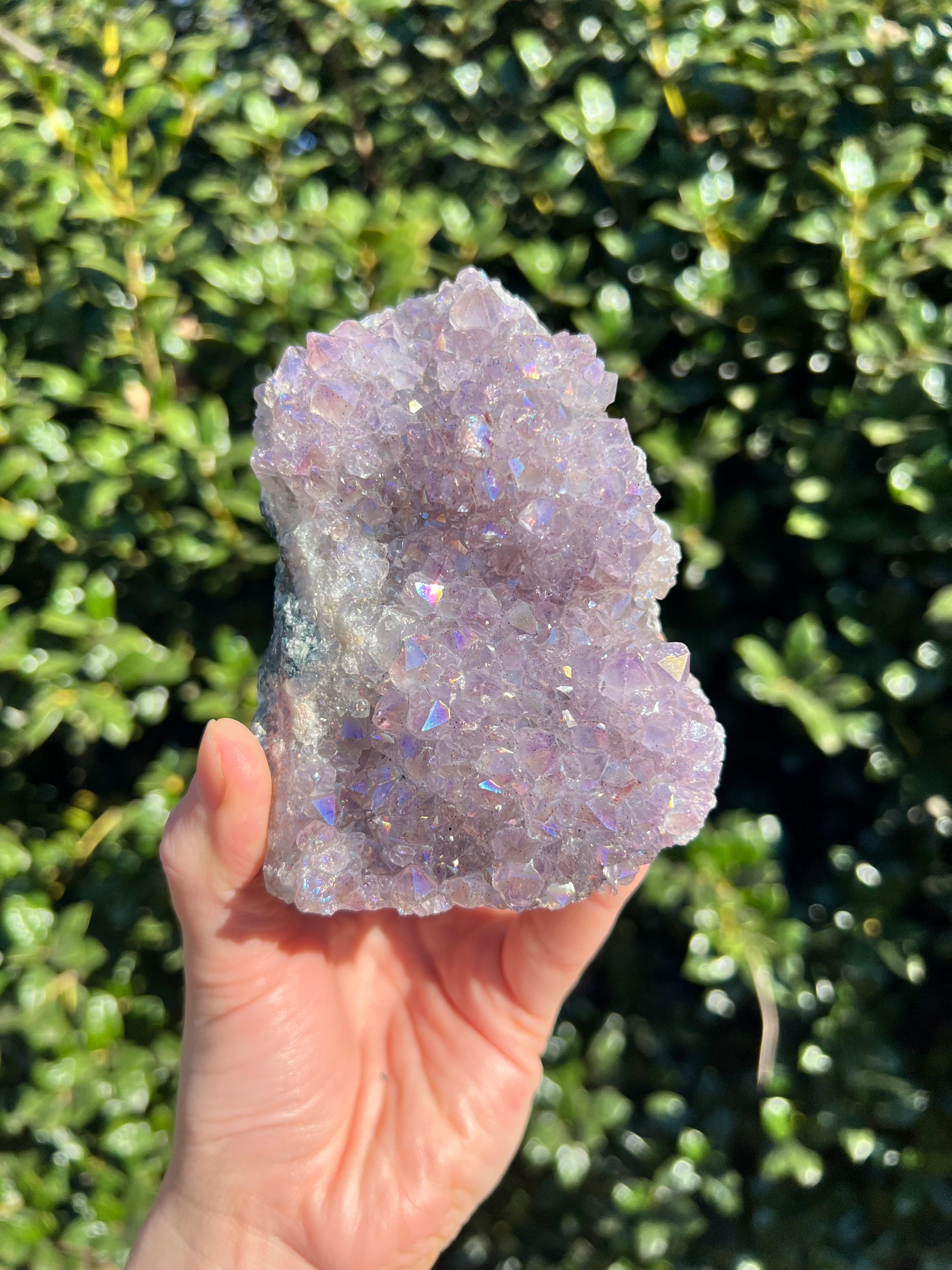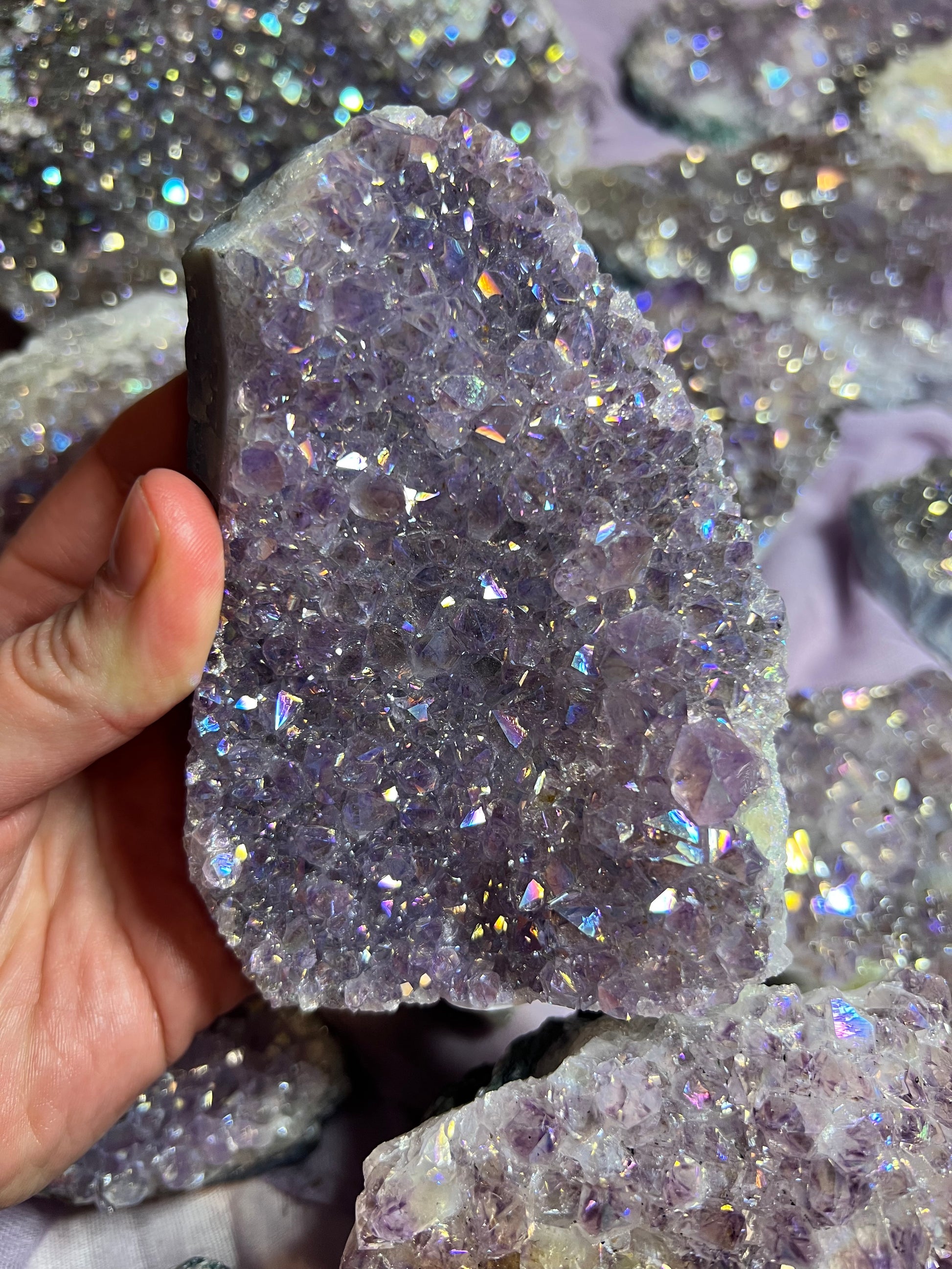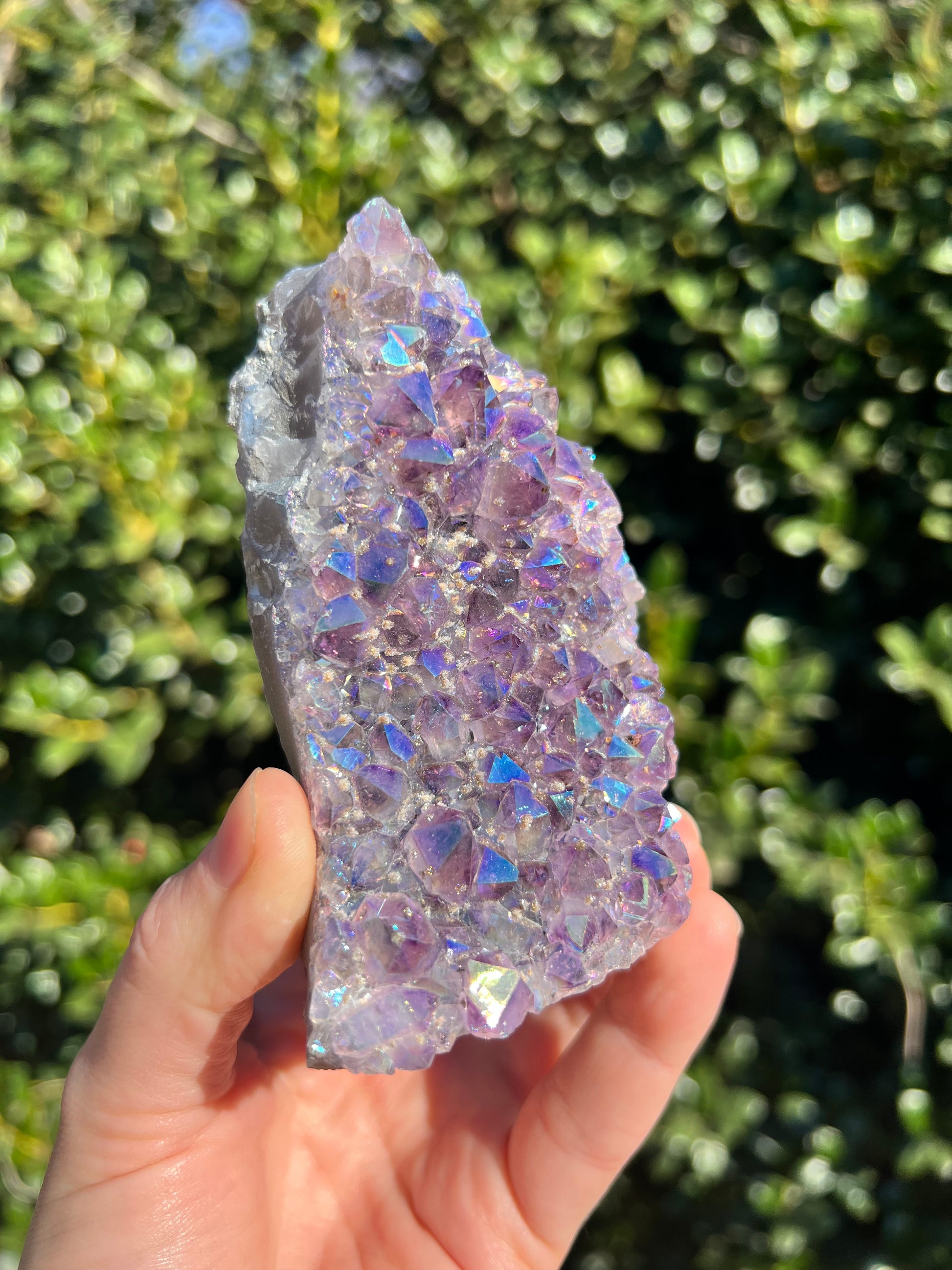 天使光环紫水晶以其独特的彩虹色外观而闻名,以一种格外神奇的方式捕捉光线!该标本由天然紫水晶(产自巴西)制成,用铂、金和银等金属混合物处理,然后经过极热处理。这一过程创造了天使光环紫水晶的彩虹色光芒,并增强了这块宝石的力量。