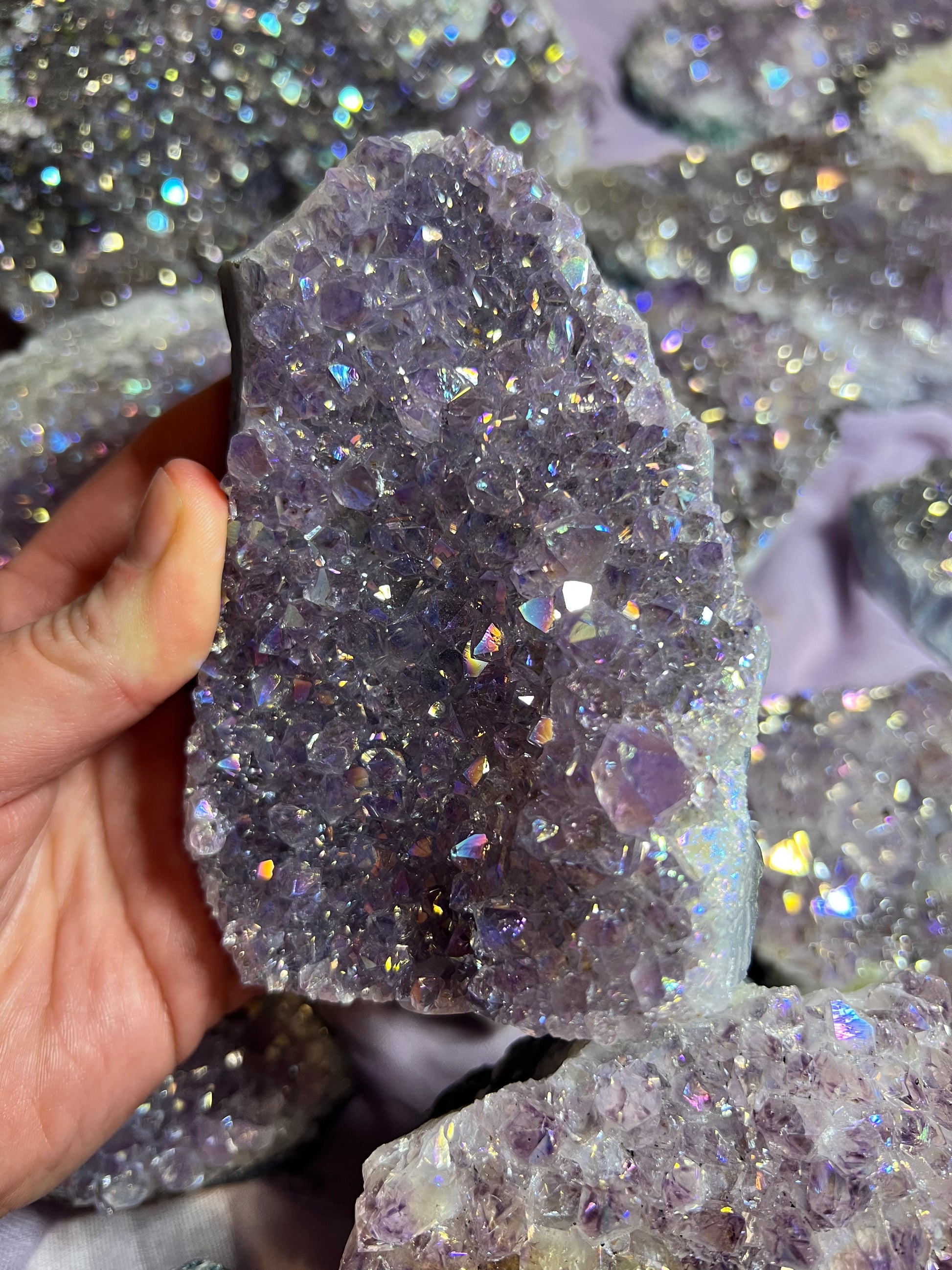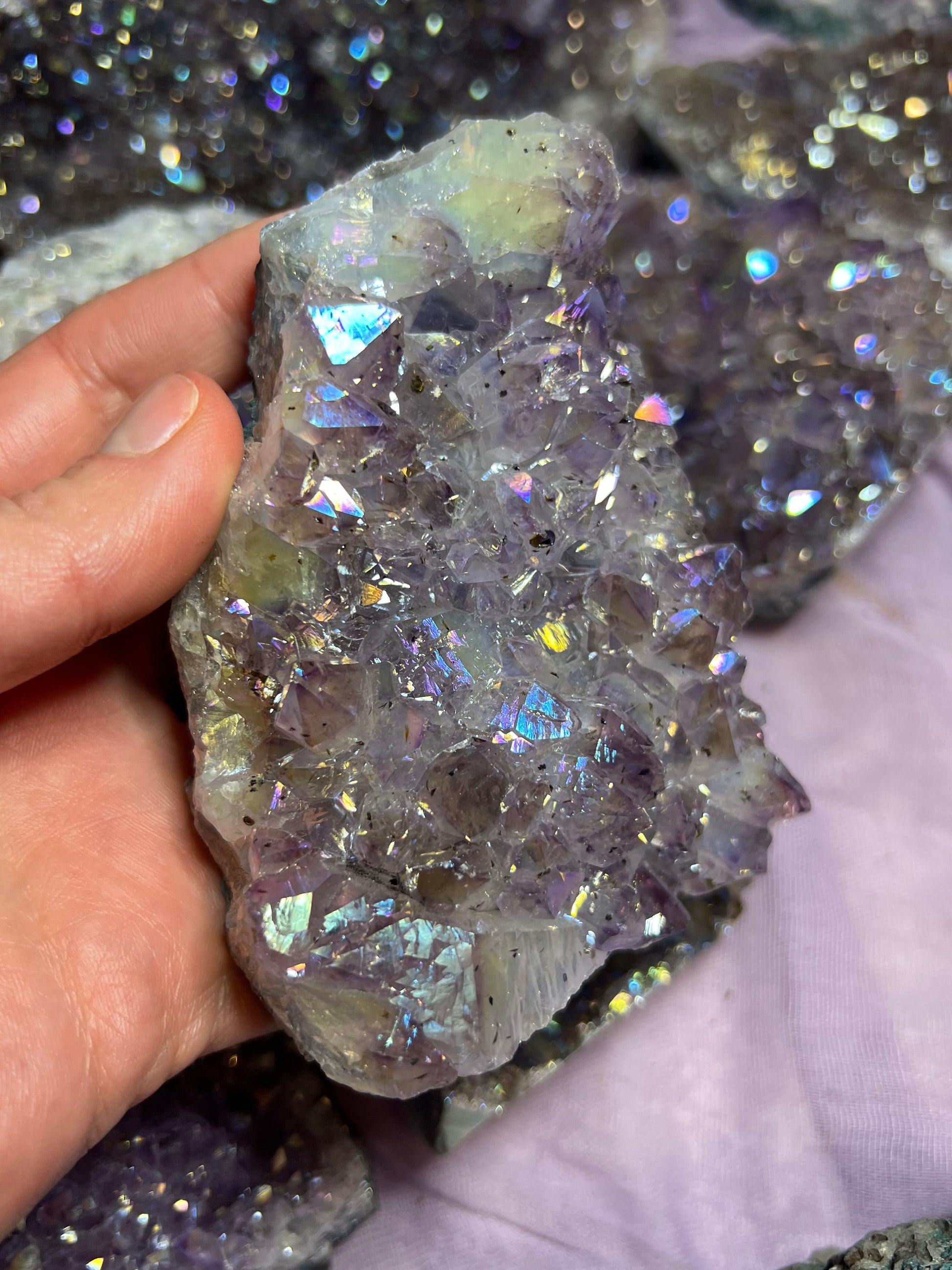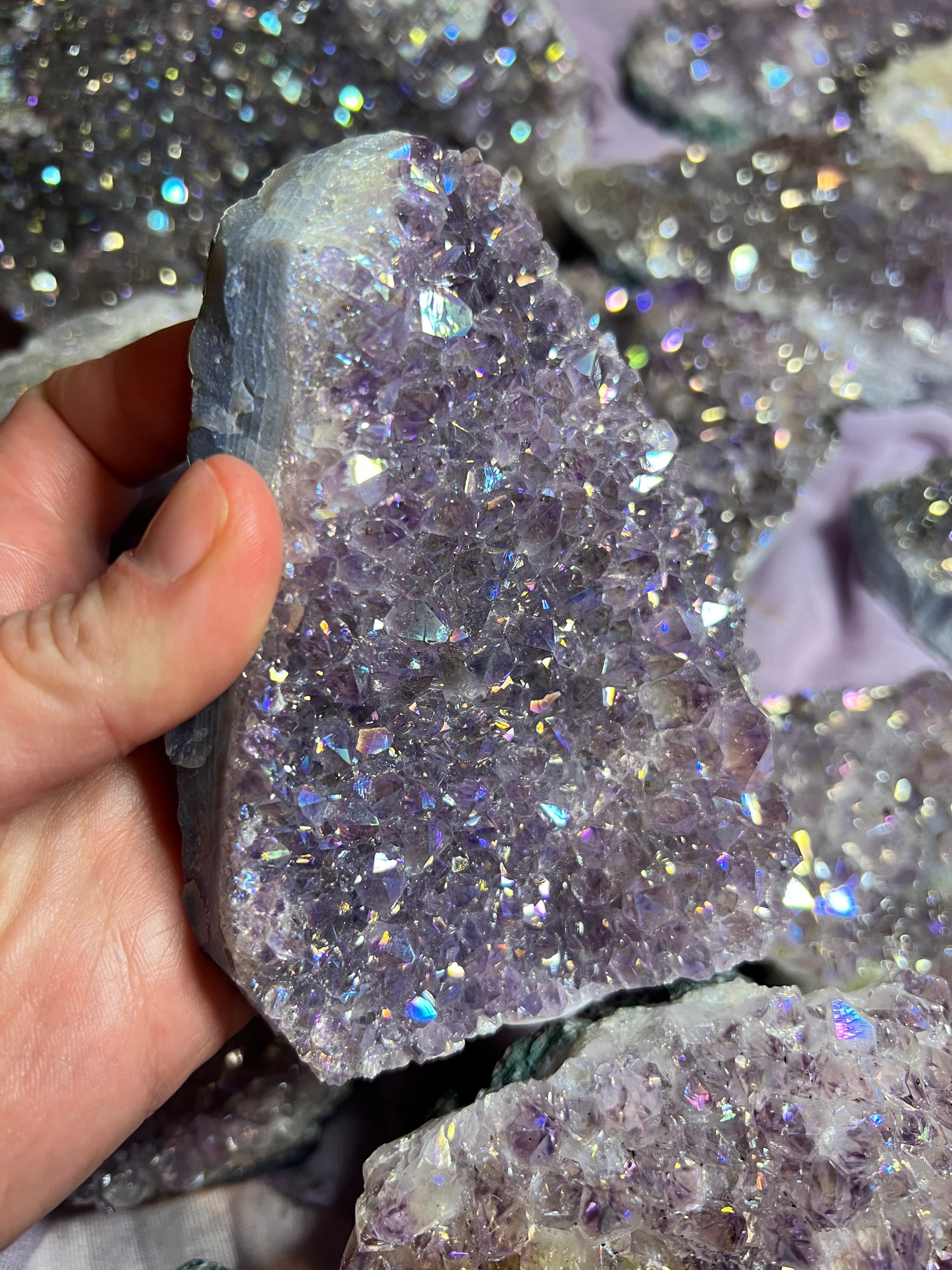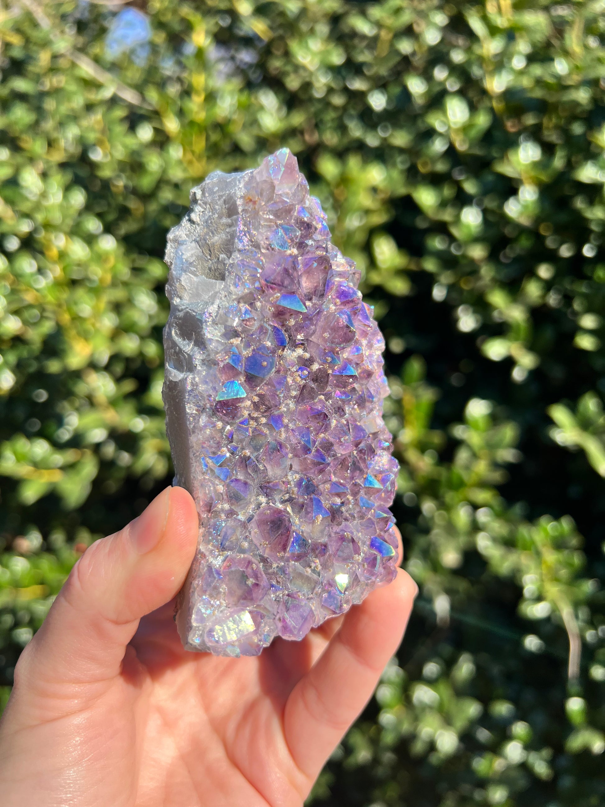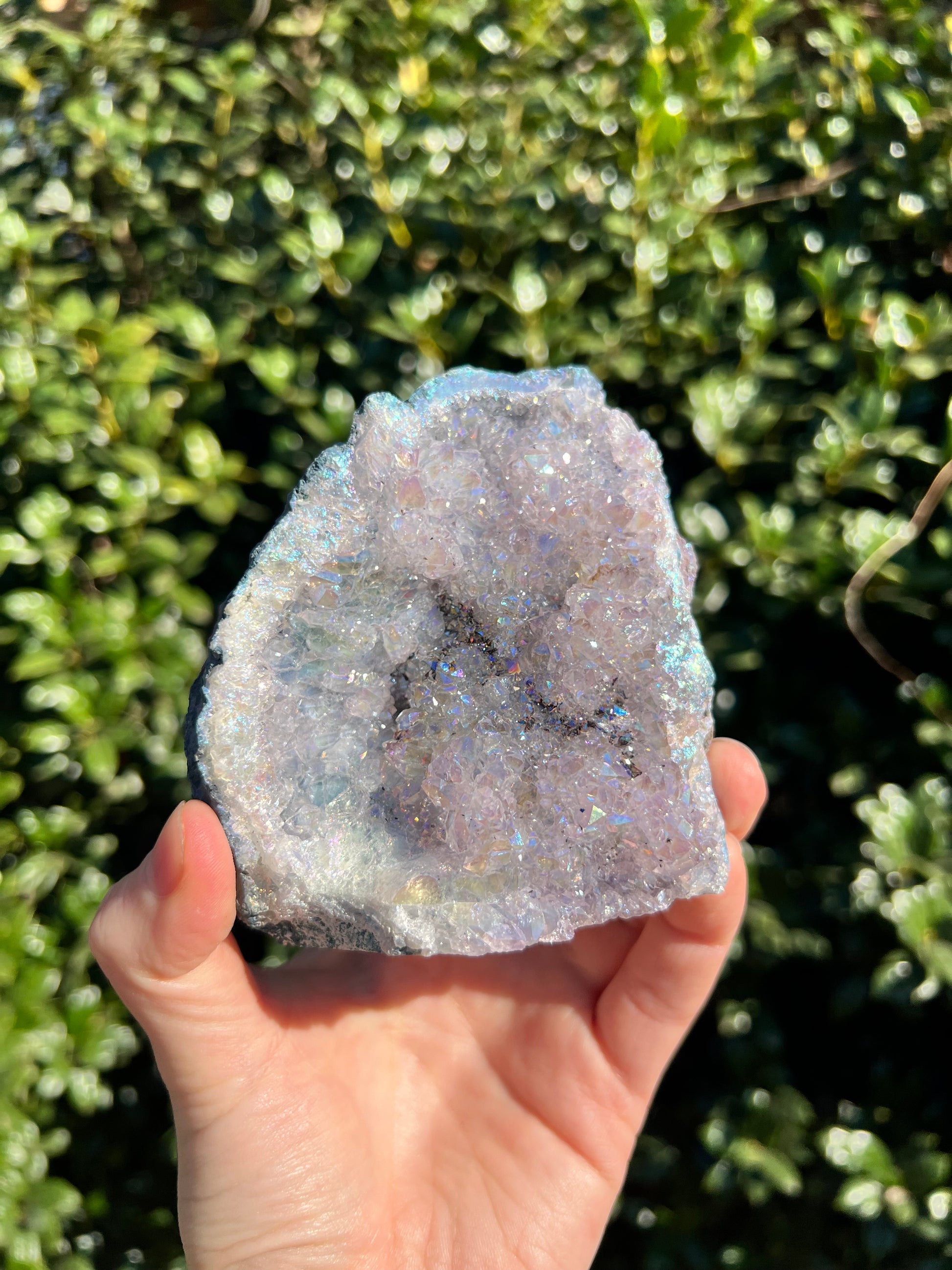 天使光环紫水晶以其独特的彩虹色外观而闻名,以一种格外神奇的方式捕捉光线!该标本由天然紫水晶(产自巴西)制成,用铂、金和银等金属混合物处理,然后经过极热处理。这一过程创造了天使光环紫水晶的彩虹色光芒,并增强了这块宝石的力量。