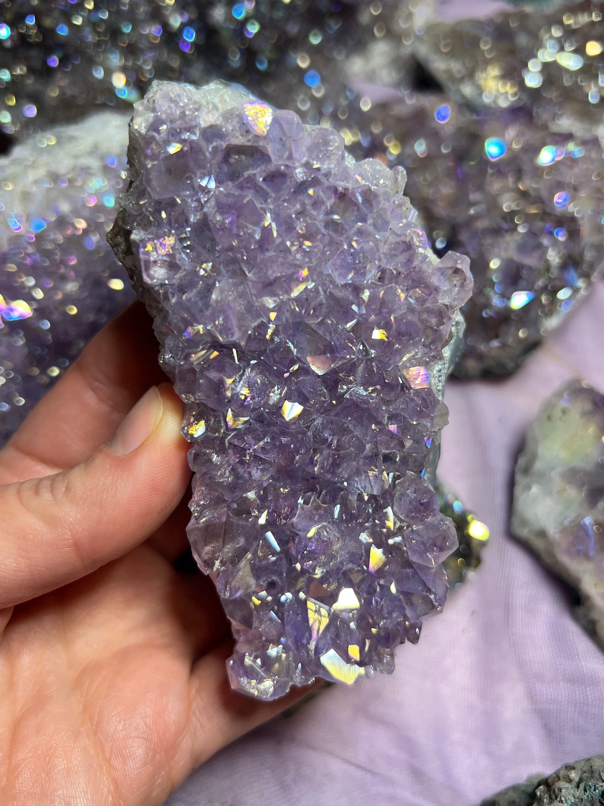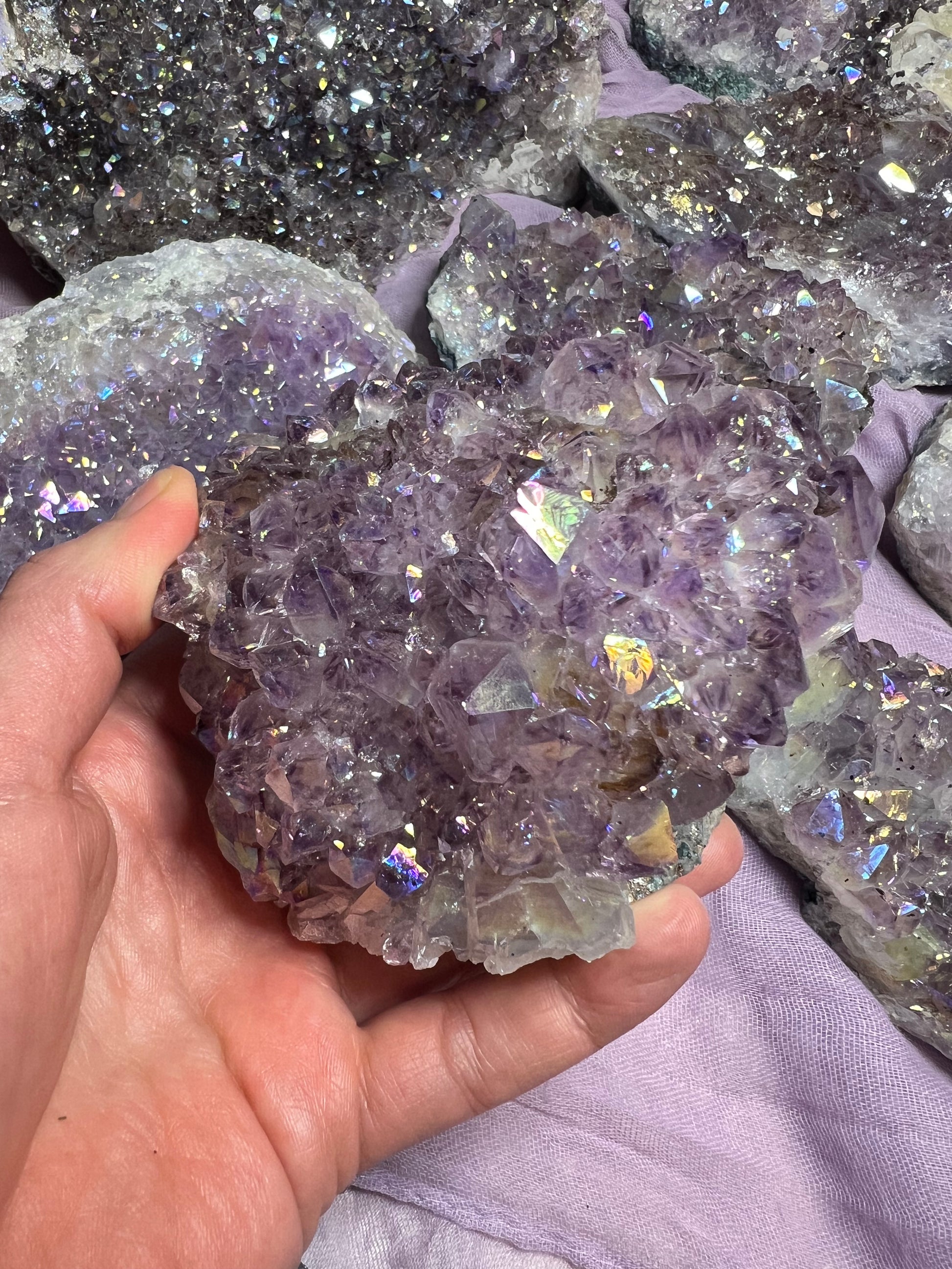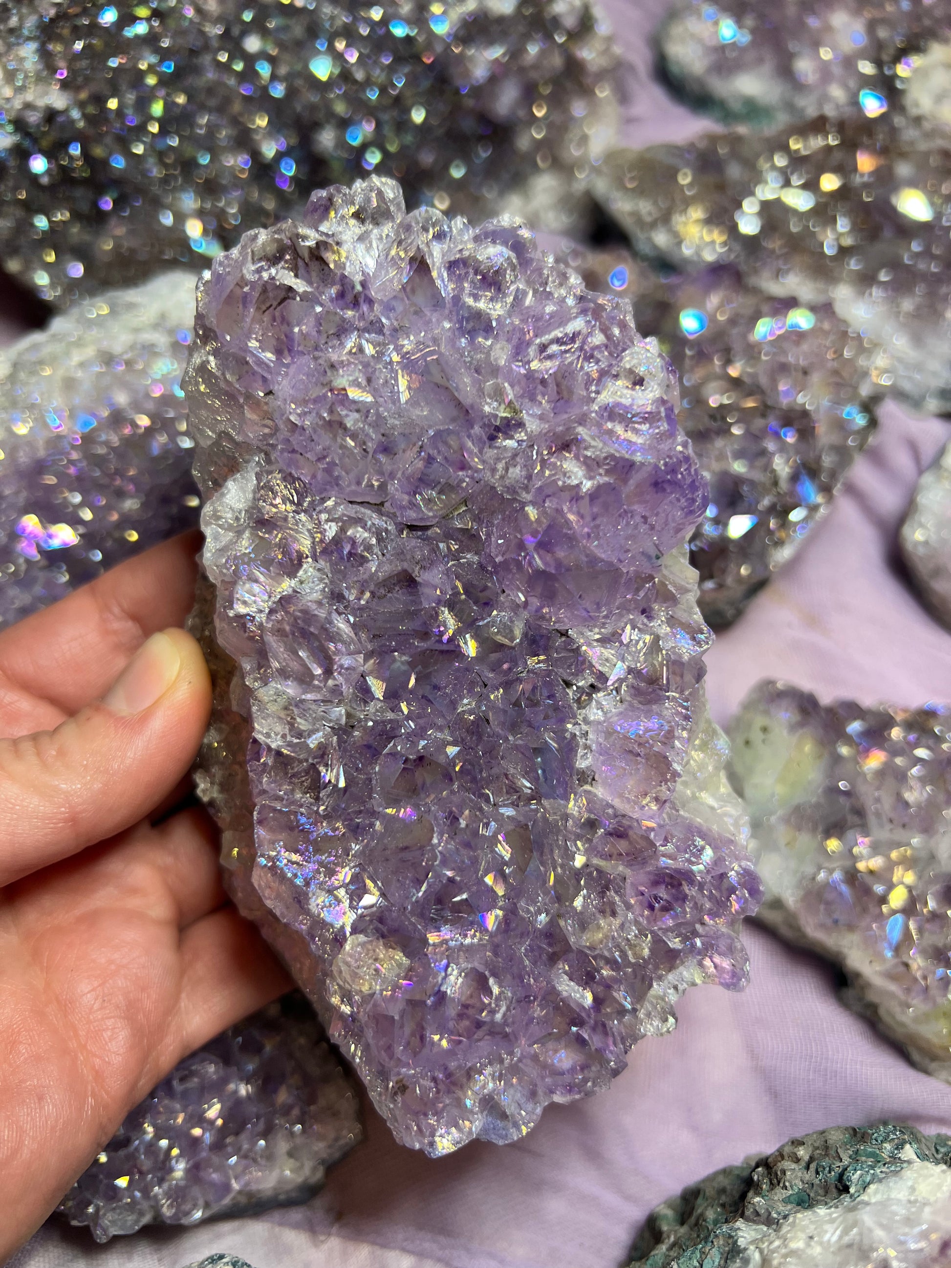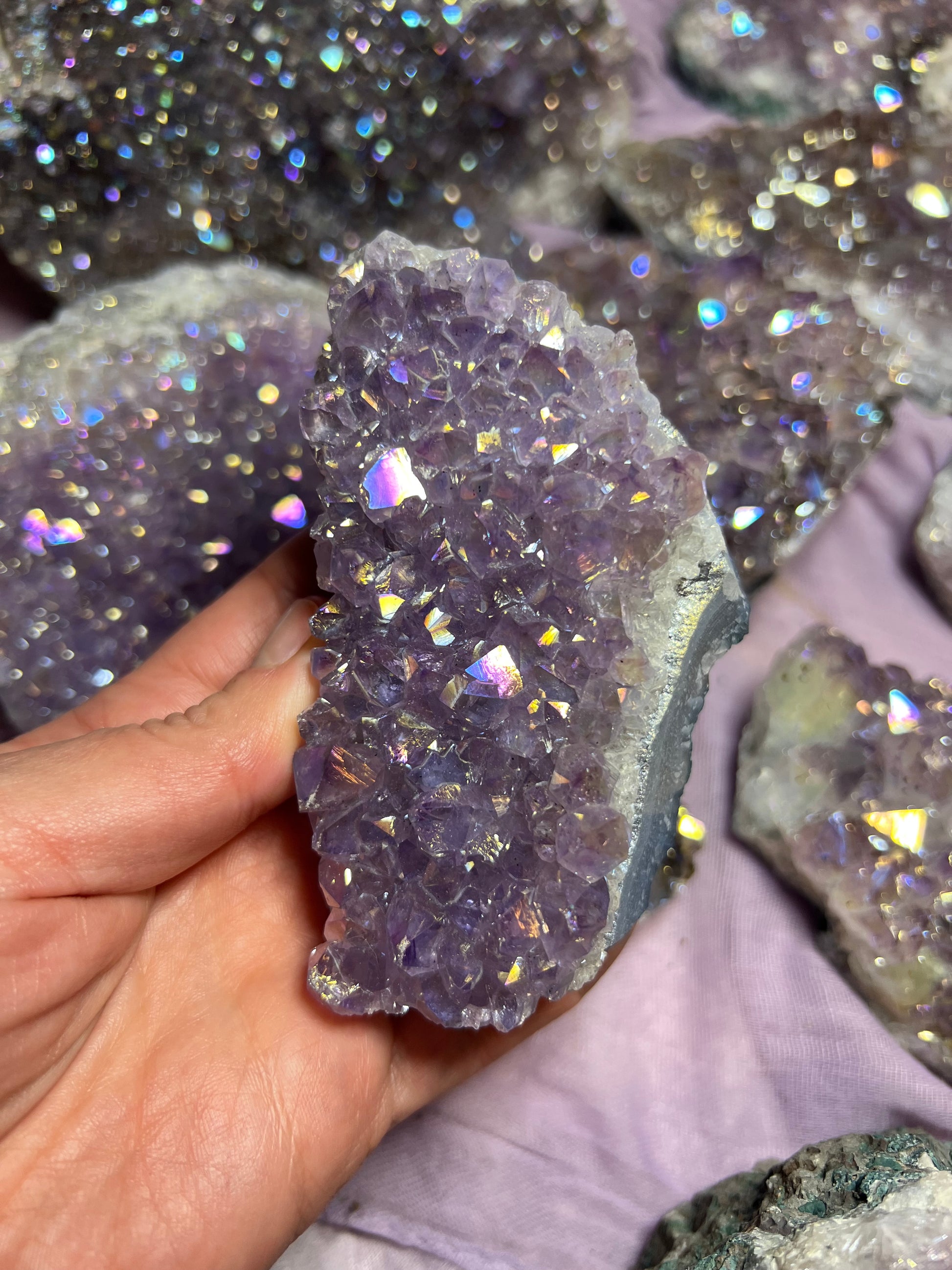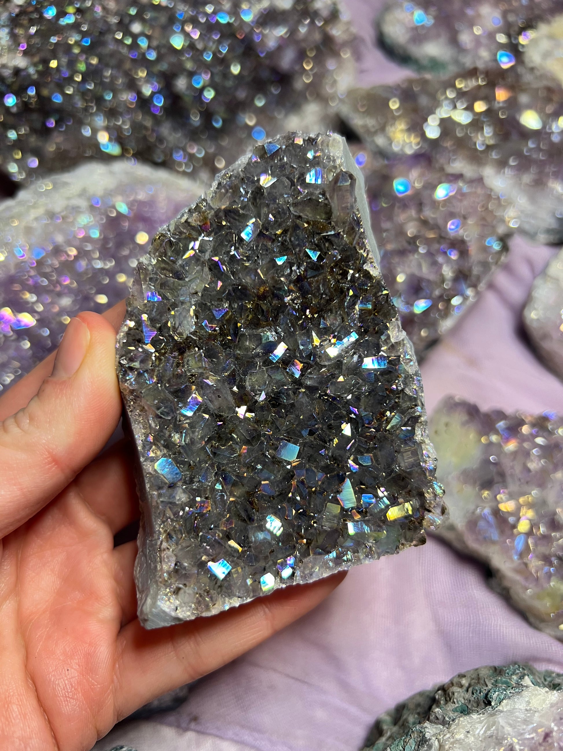 天使光环紫水晶以其独特的彩虹色外观而闻名,以一种格外神奇的方式捕捉光线!该标本由天然紫水晶(产自巴西)制成,用铂、金和银等金属混合物处理,然后经过极热处理。这一过程创造了天使光环紫水晶的彩虹色光芒,并增强了这块宝石的力量。