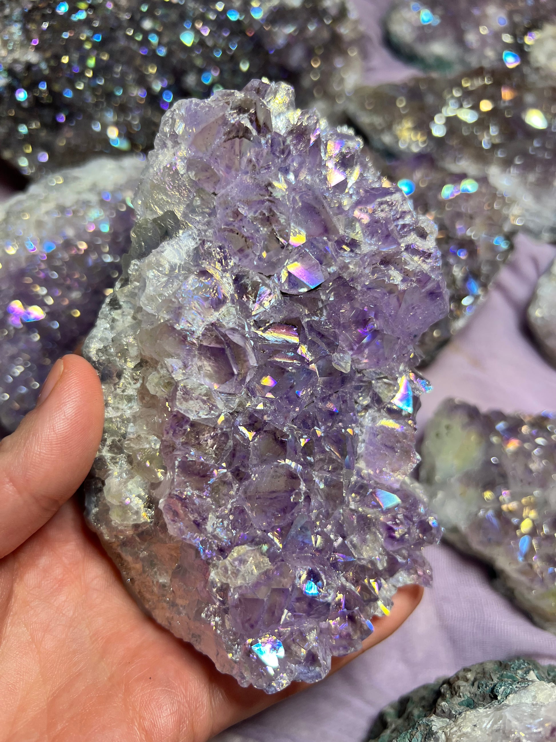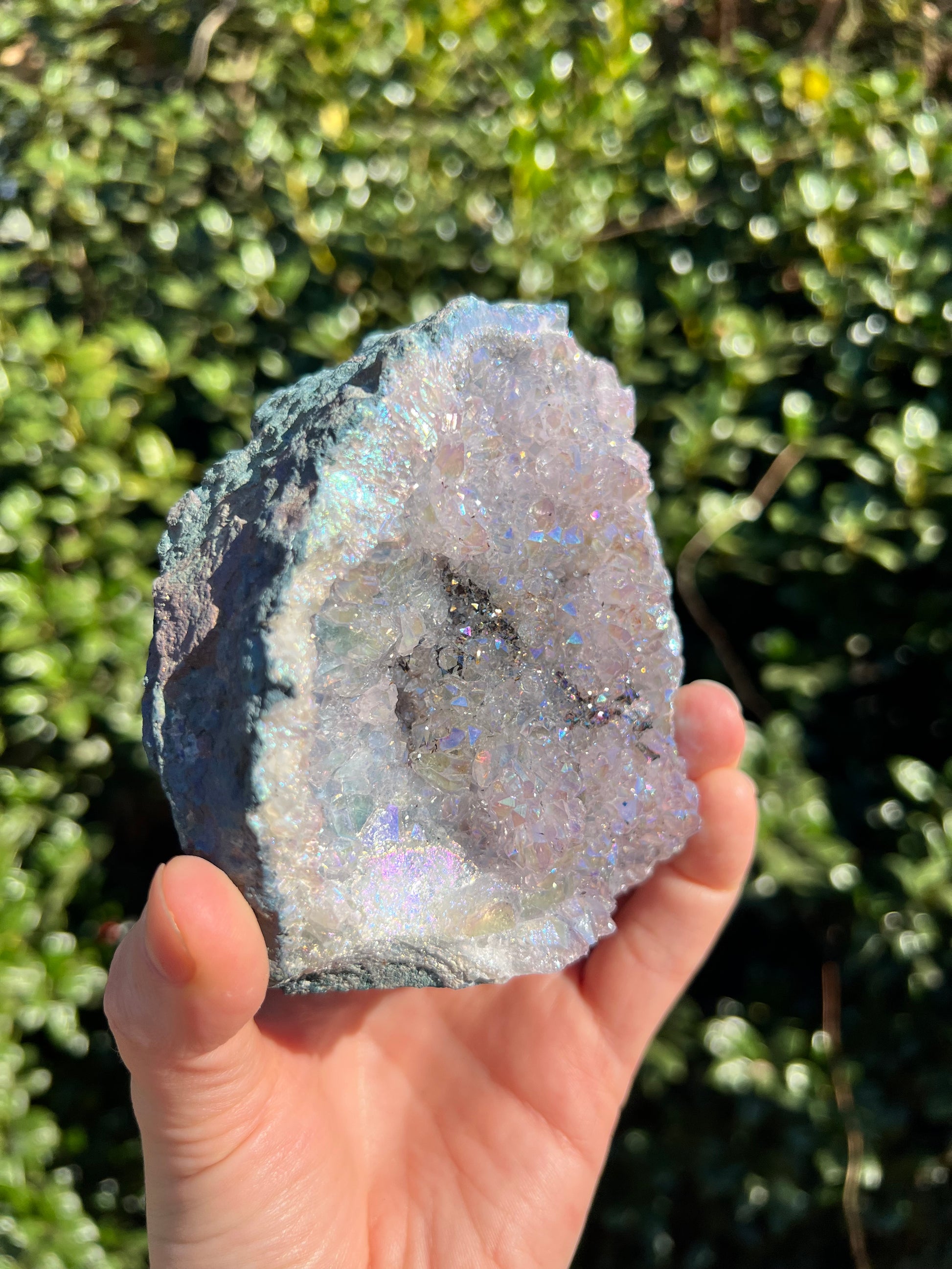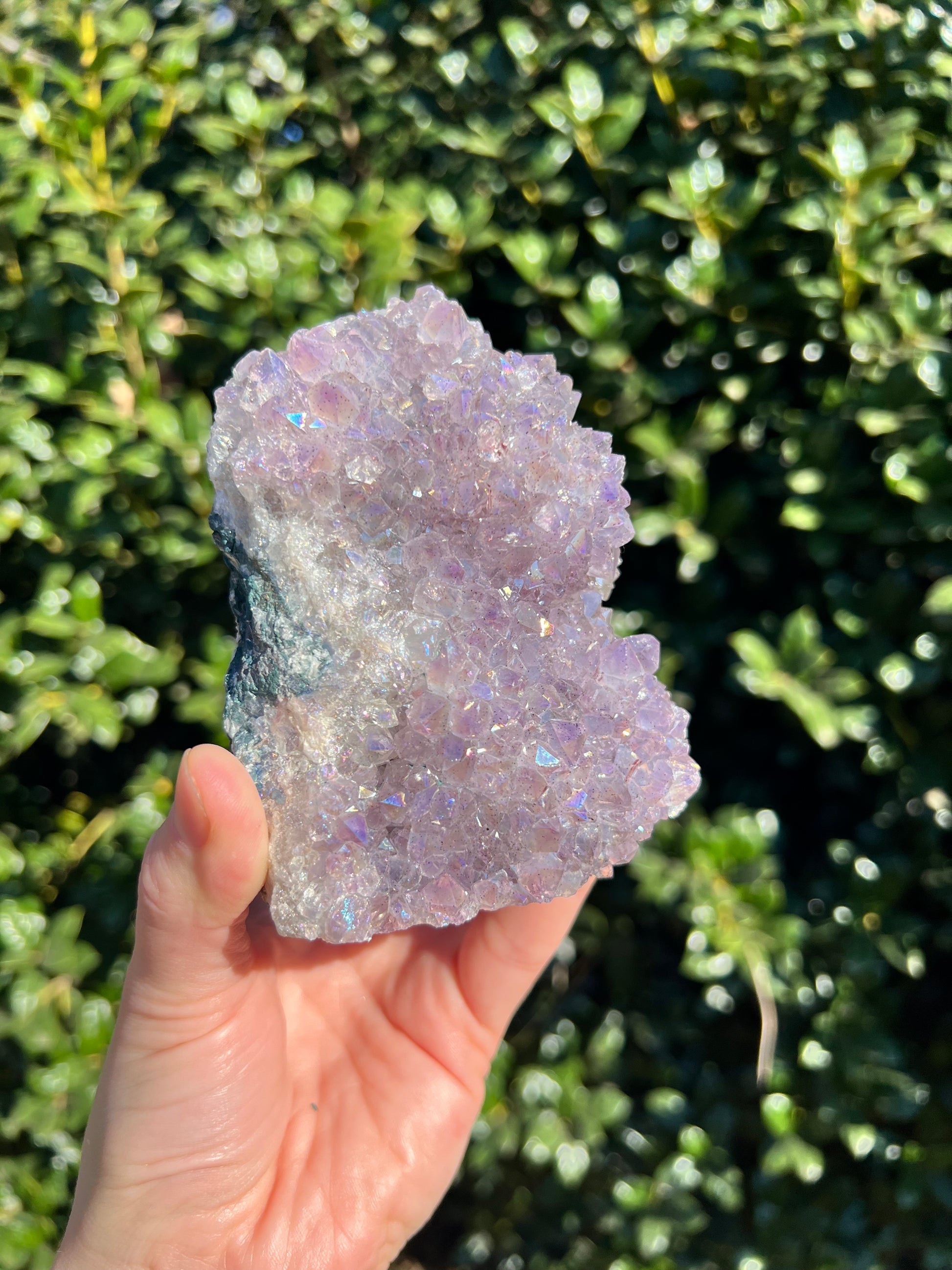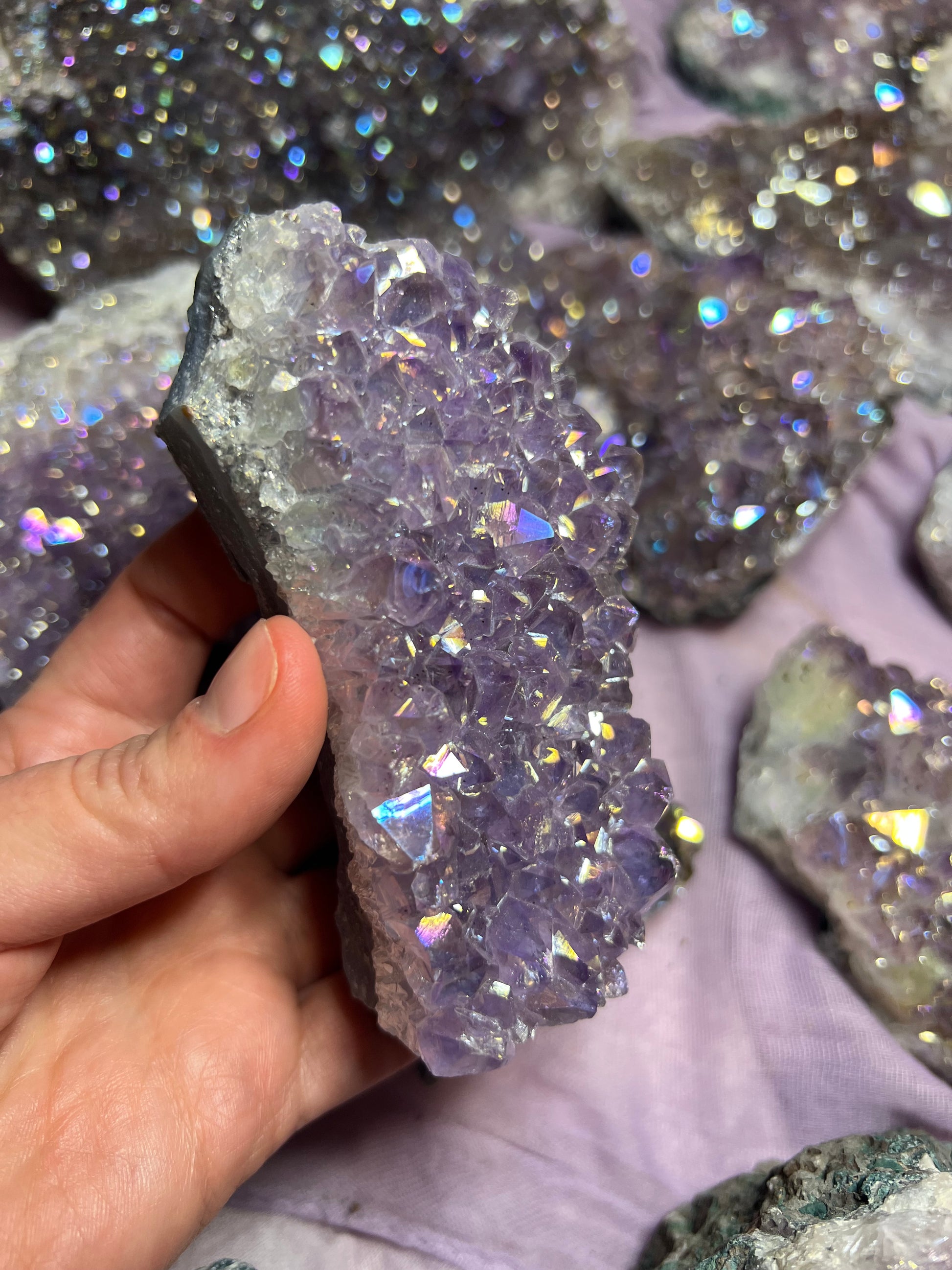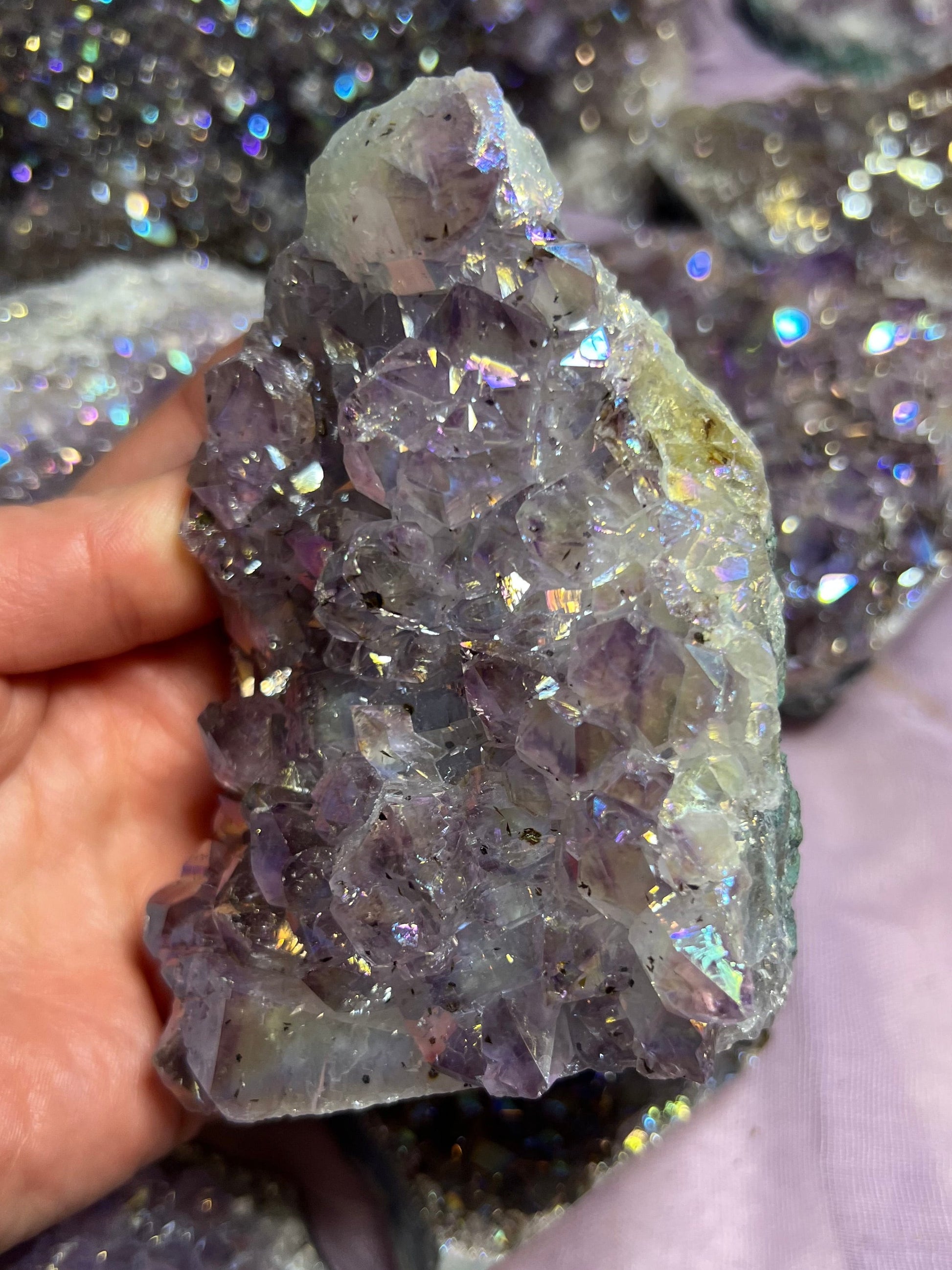 天使光环紫水晶以其独特的彩虹色外观而闻名,以一种格外神奇的方式捕捉光线!该标本由天然紫水晶(产自巴西)制成,用铂、金和银等金属混合物处理,然后经过极热处理。这一过程创造了天使光环紫水晶的彩虹色光芒,并增强了这块宝石的力量。