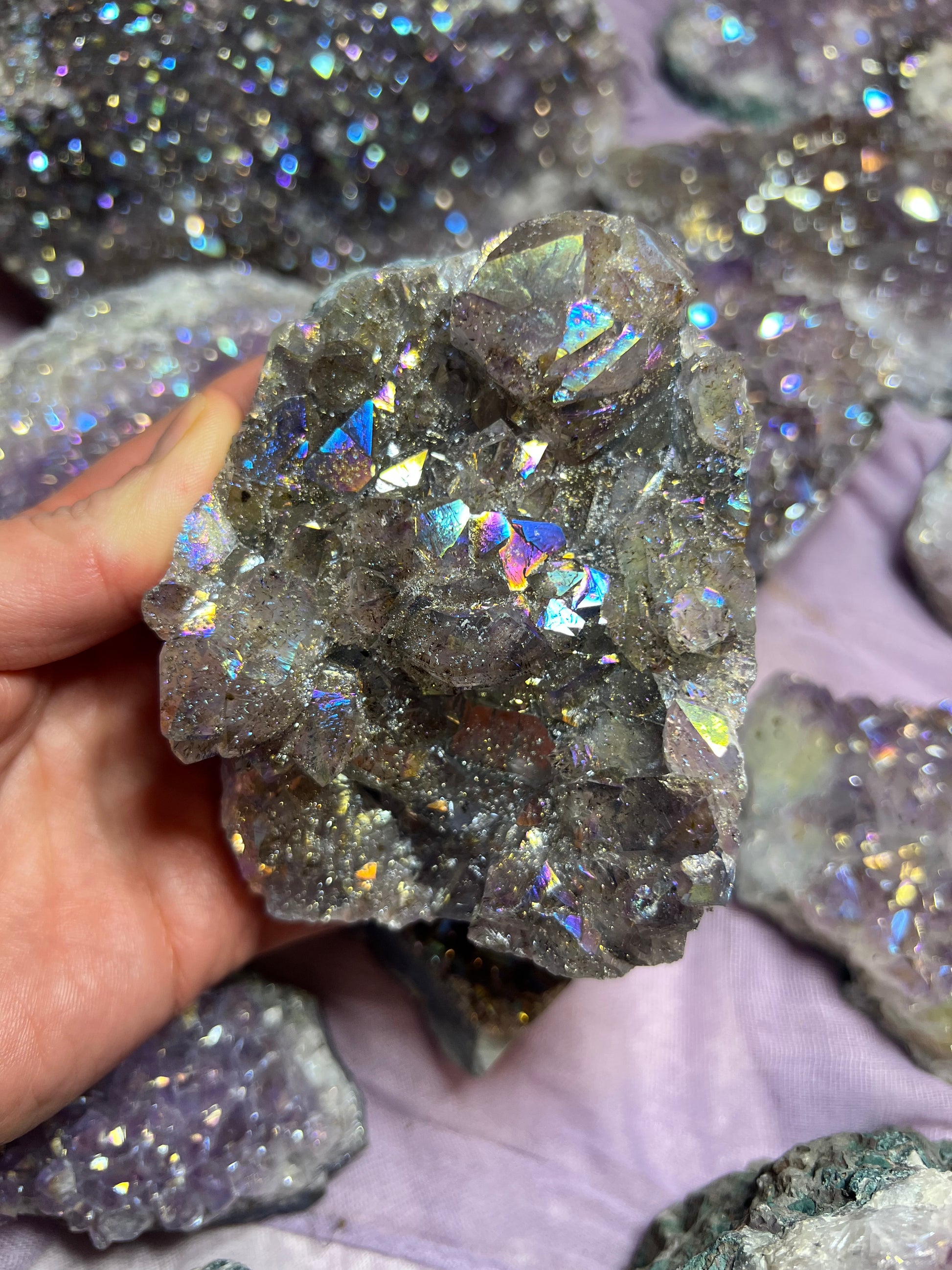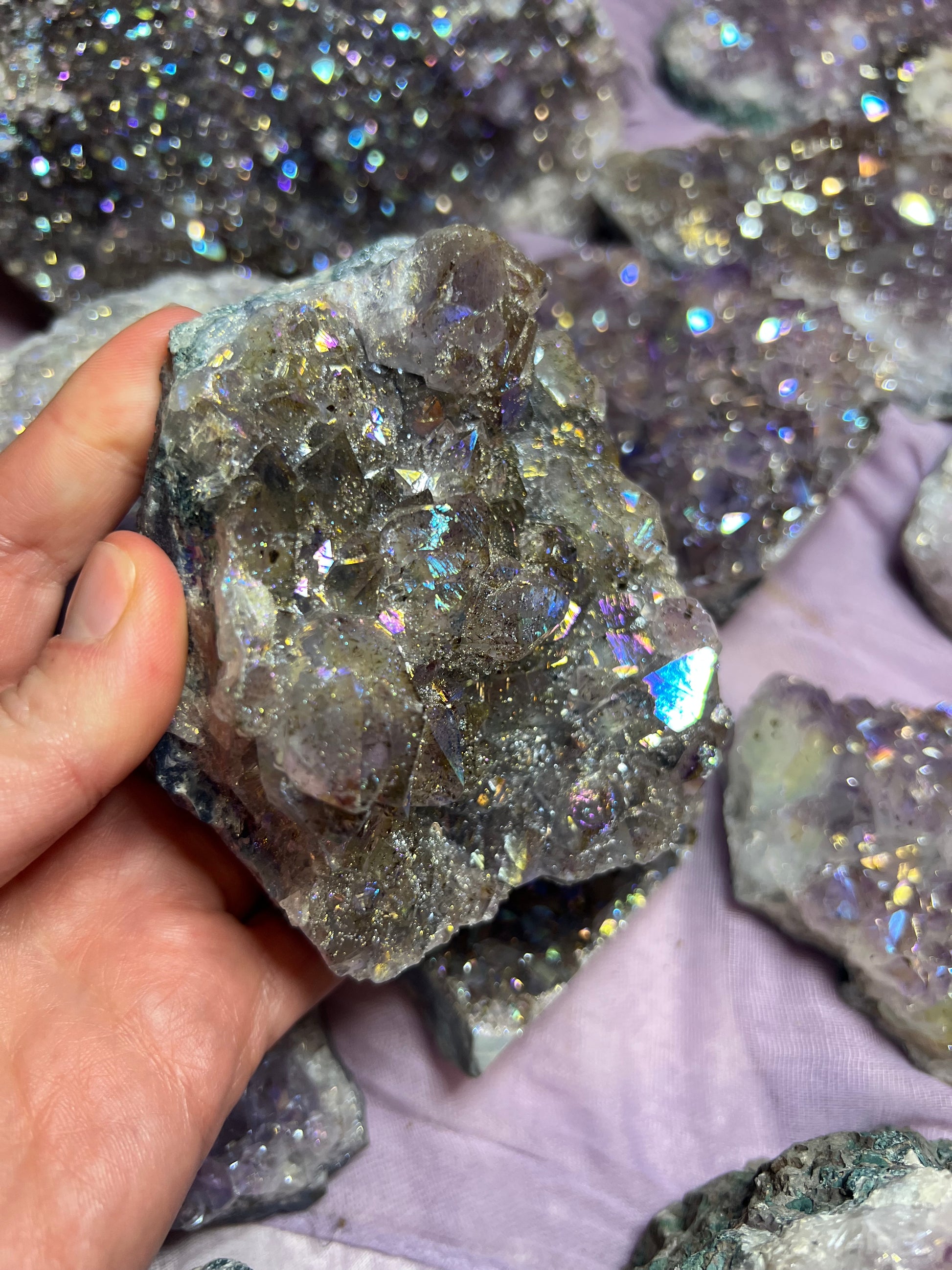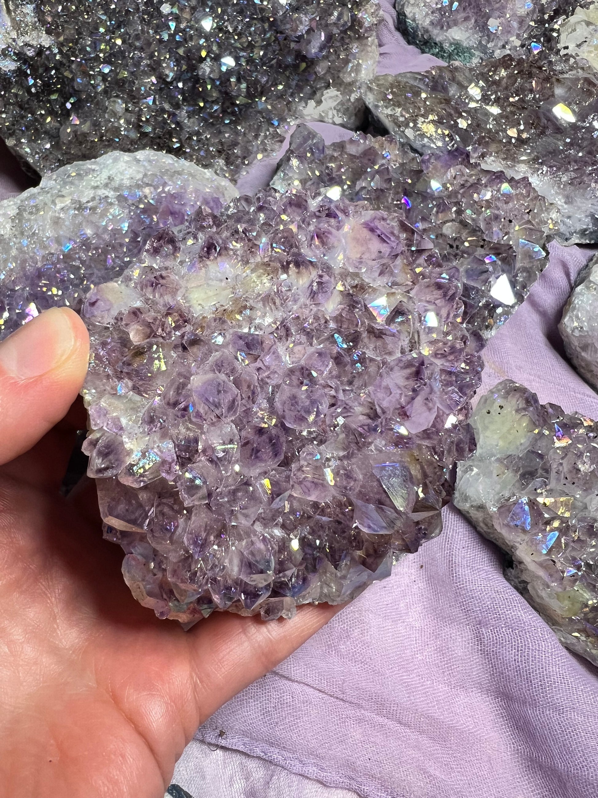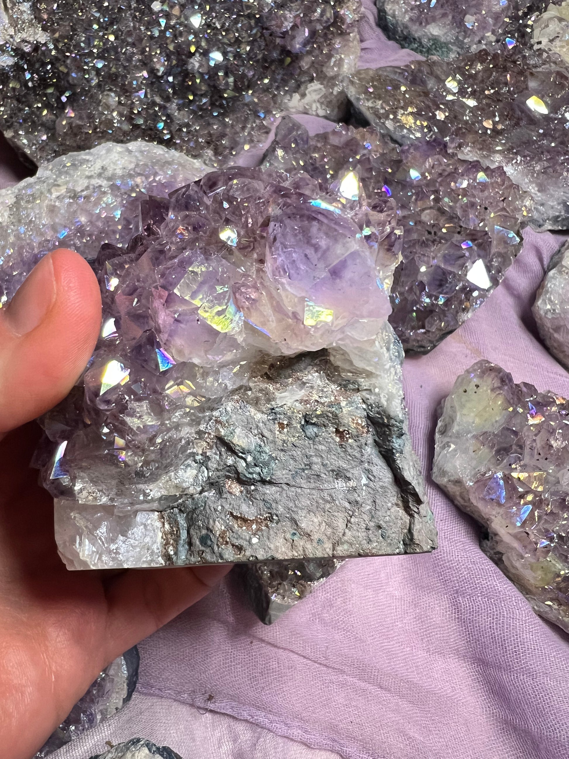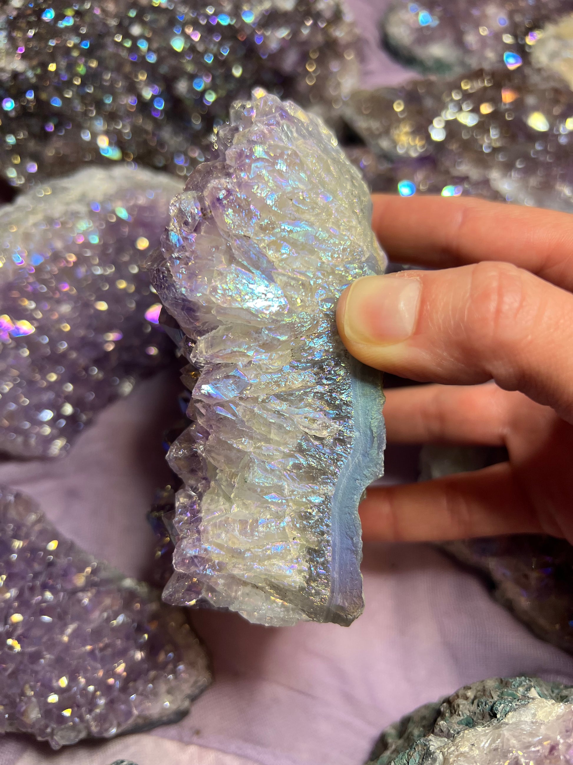 天使光环紫水晶以其独特的彩虹色外观而闻名,以一种格外神奇的方式捕捉光线!该标本由天然紫水晶(产自巴西)制成,用铂、金和银等金属混合物处理,然后经过极热处理。这一过程创造了天使光环紫水晶的彩虹色光芒,并增强了这块宝石的力量。