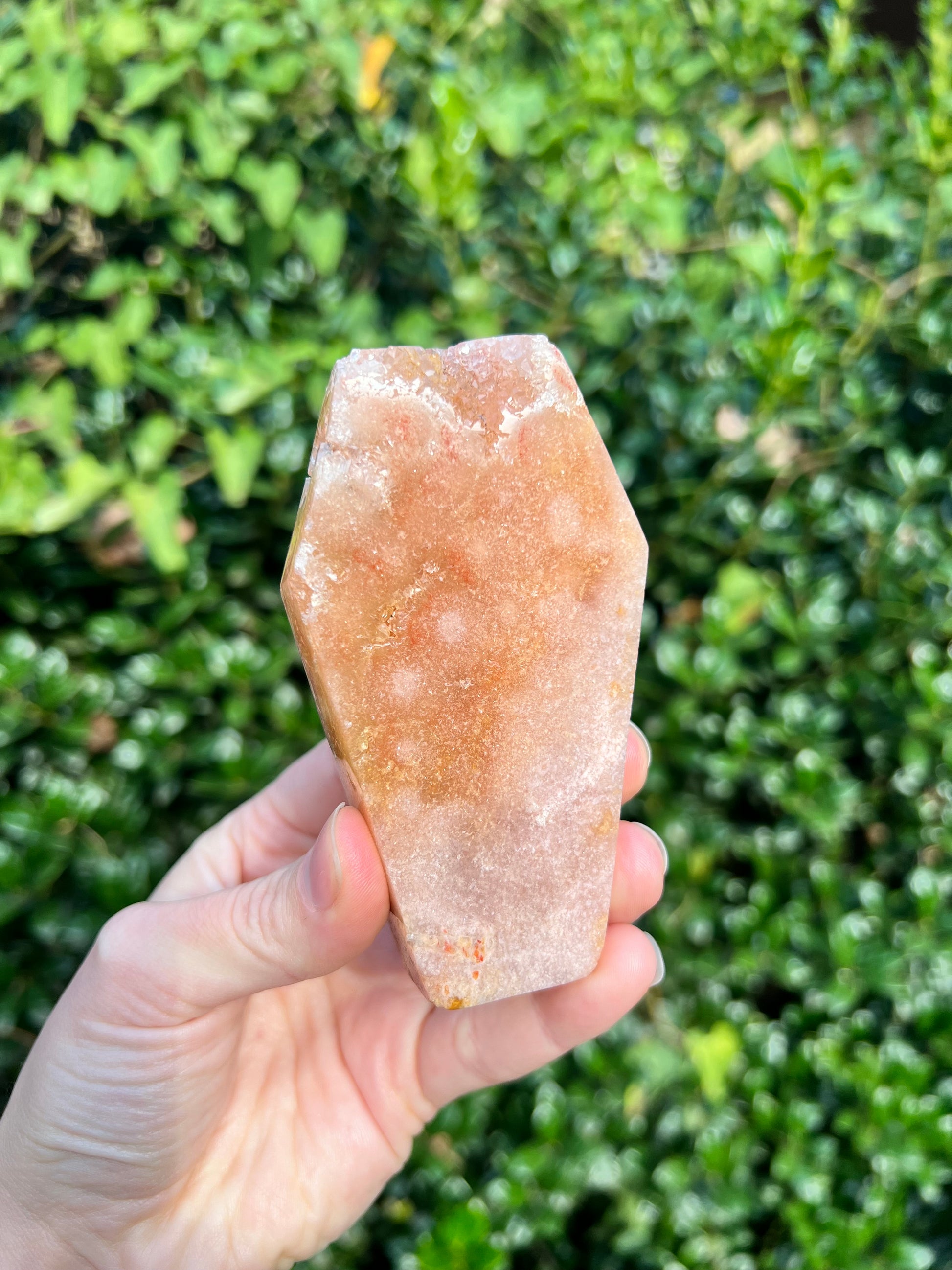 Experience the serene loving energy of Pink Amethyst! Like Amethyst, Pink Amethyst is a healing stone. The pink hue signals its focus on healing and opening the heart chakra. The iron within the stone, which causes the pink hue, contains grounding energy that activates the root chakra. Hand carved into a coffin shape, this coffin has hauntingly positive energy!