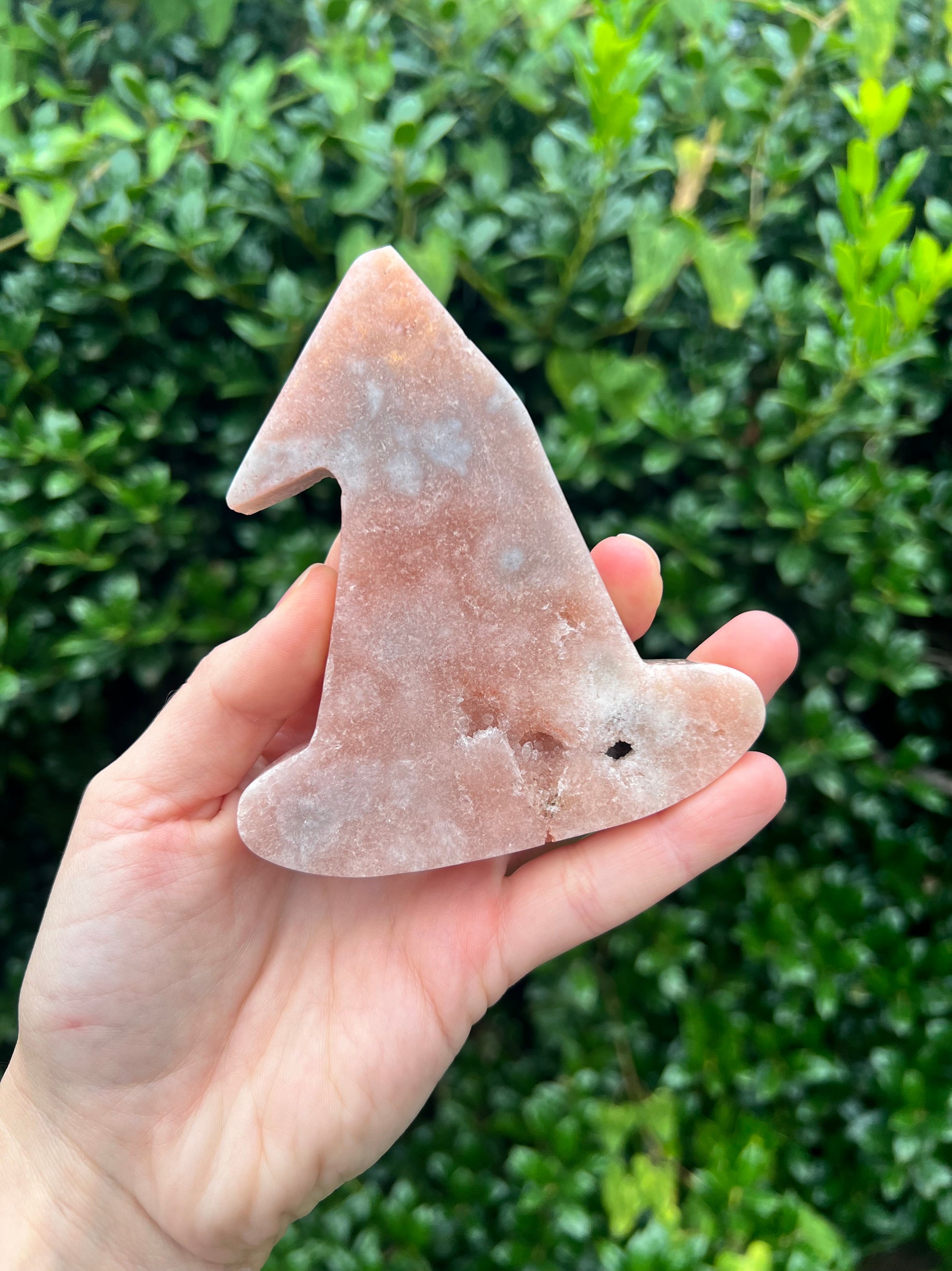 Experience the serene loving energy of Pink Amethyst! Like Amethyst, Pink Amethyst is a healing stone. The pink hue signals its focus on healing and opening the heart chakra. The iron within the stone, which causes the pink hue, contains grounding energy that activates the root chakra. Hand carved into this adorable Witch's Hat shape, this would make the perfect stone for the witchy folks in your life!